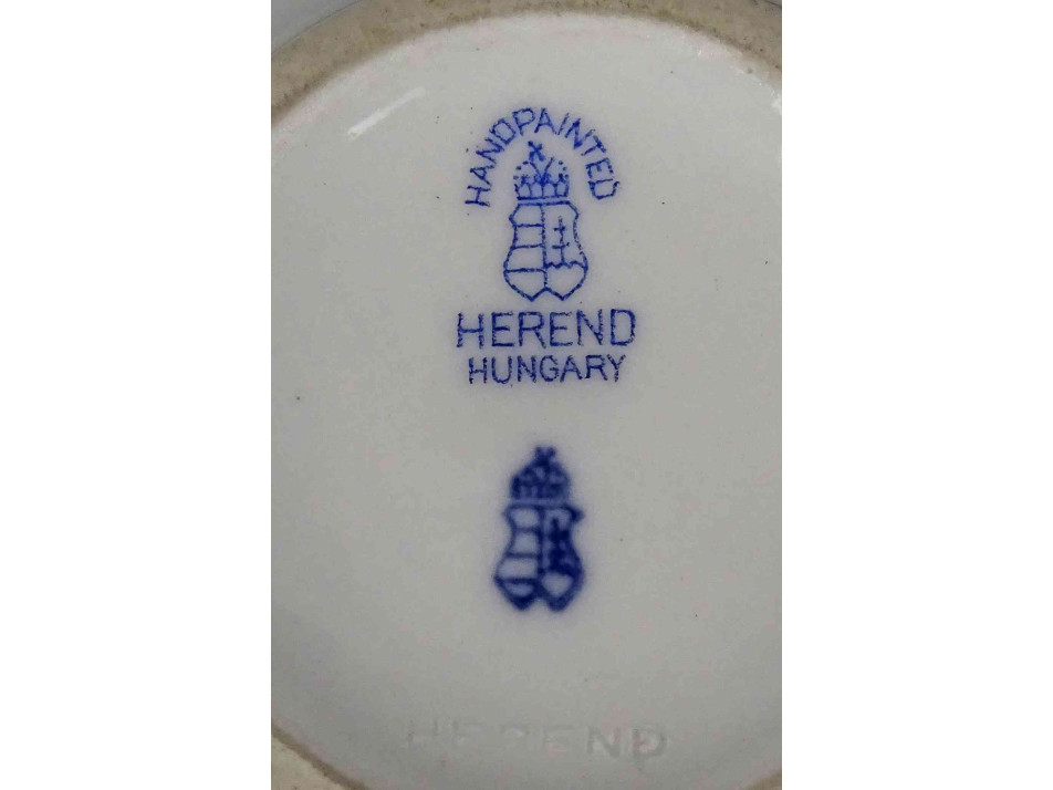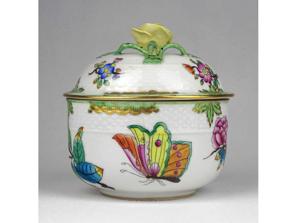 Antik, háború előtti jelzéssel ellátott, kézi festésű Viktória mintás, rózsás Herendi porcelán bonbonier. A rózsa-fogantyú restaurátor által szakszerűen javított.
