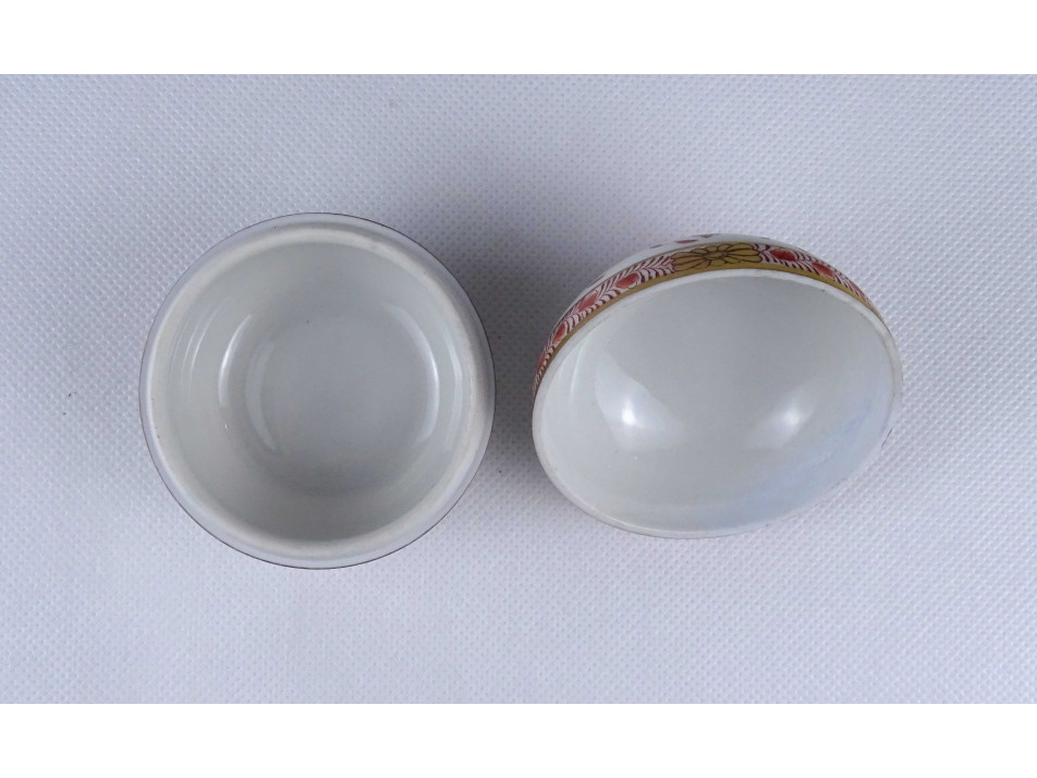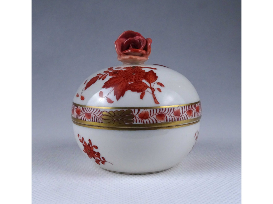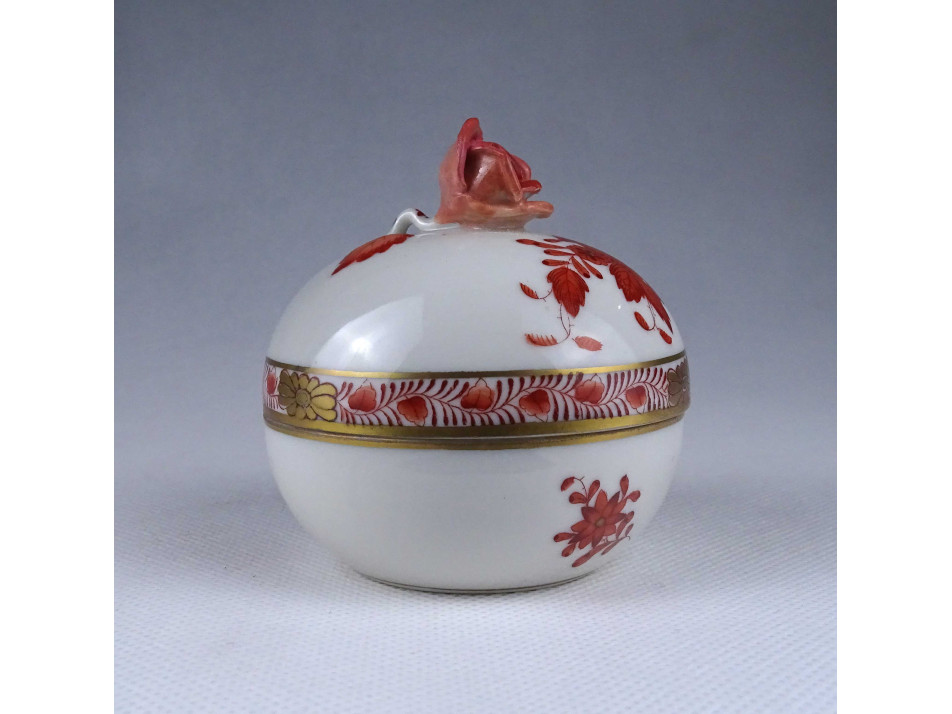 Régi, hibátlan állapotú, narancs színű Apponyi mintás, rózsás herendi bonbonier. A fedél pereme és a rózsa foggantyú restaurátor által szakszerűen javított.
