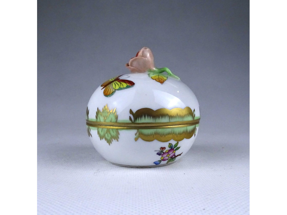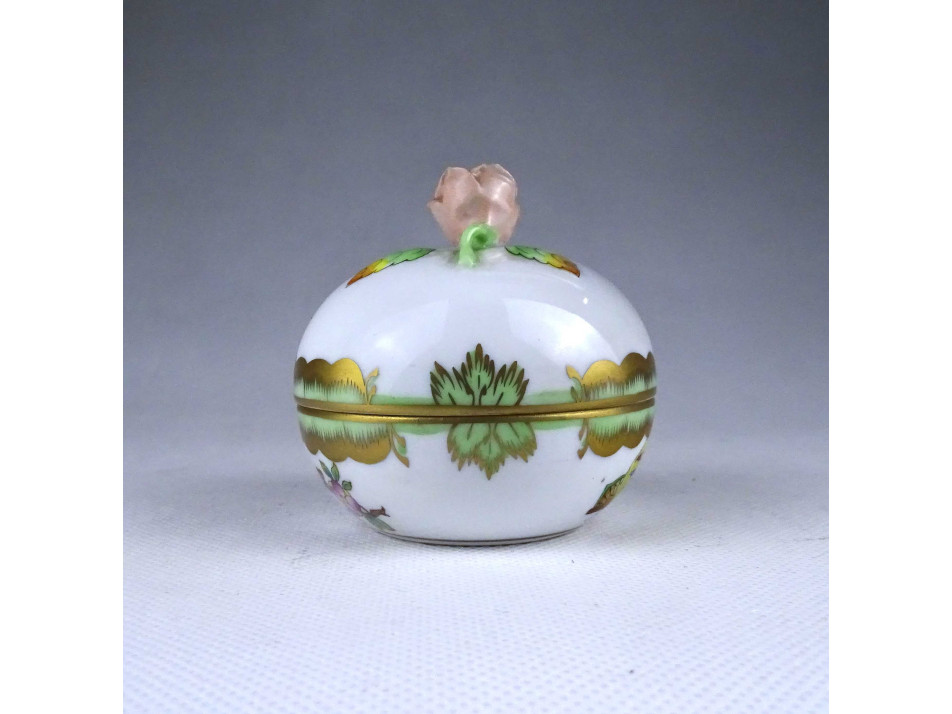 Régi, hibátlan állapotú, Viktória mintás Herendi porcelán ékszertartó bonbonier, fedelén plasztikus rózsa fogantyúval.