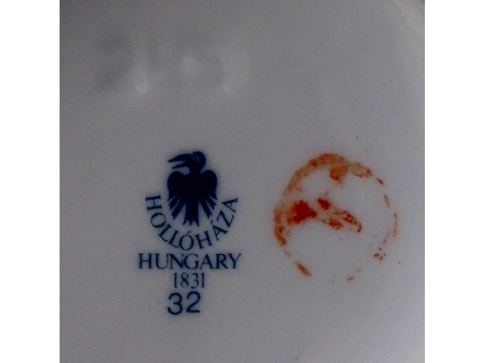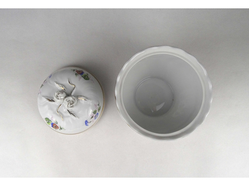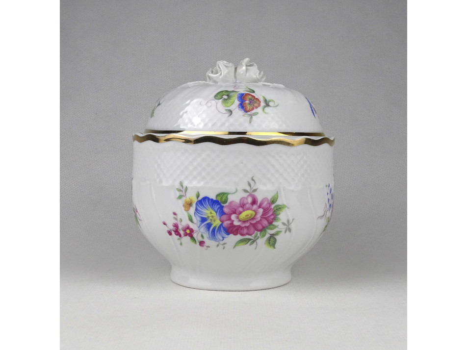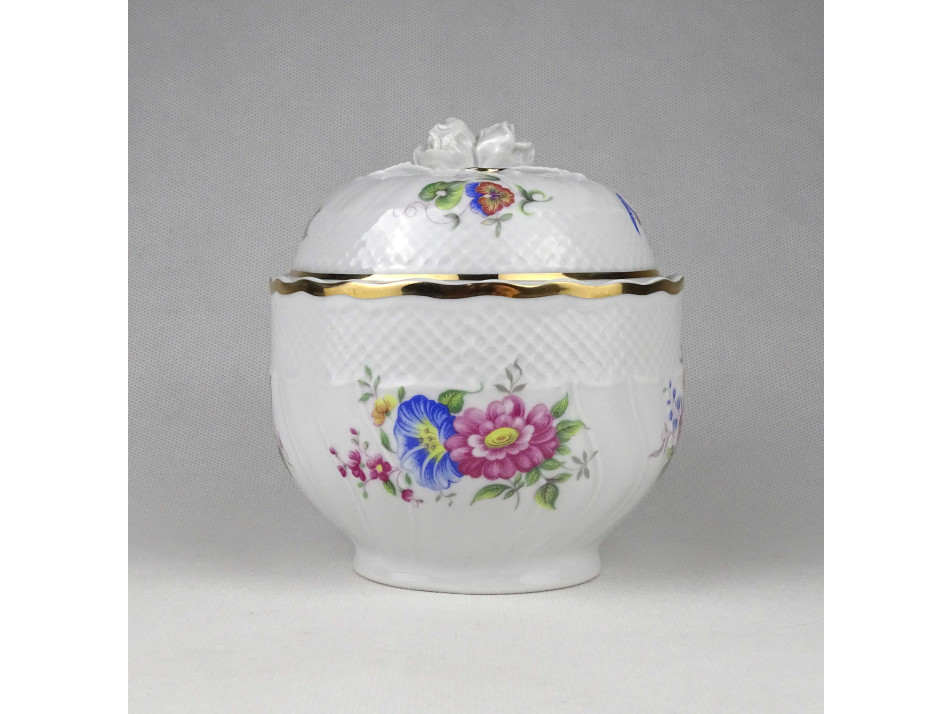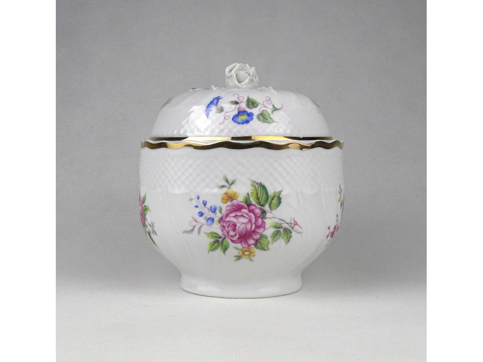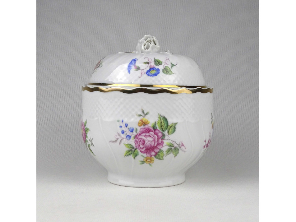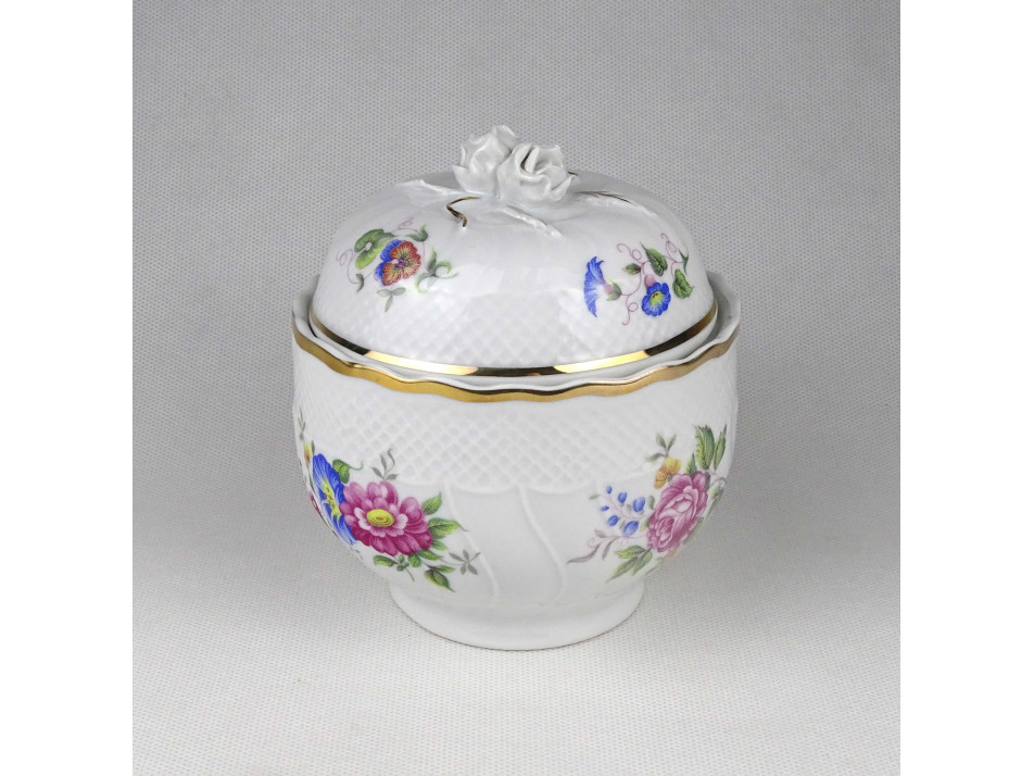 Hibátlan állapotú, aranyozott peremű, nagy méretű Hajnalka mintás Hollóházi porcelán bonbonier, ékszertartó, gyűrűtartó, tetején dupla rózsa díszítéssel.