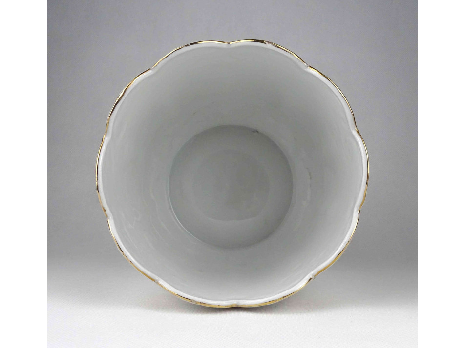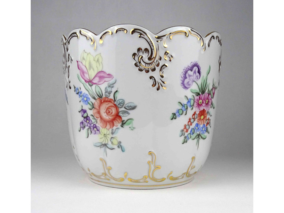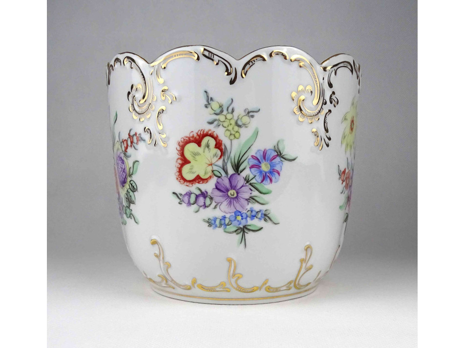 Hibátlan állapotú, nagyméretű, barokkos formavilágú, gazdagon aranyozott, kézzel festett virágmintás, jelzett Hollóházi porcelán kaspó.