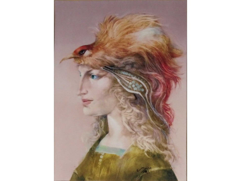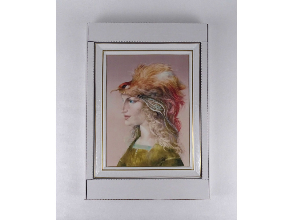 Hibátlan állapotú, valódi arannyal aranyozott, madaras fejdíszes női portrét ábrázoló Szász Endre hollóházi porcelán falikép. Falra akasztási lehetőséggel rendelkezik. Eredeti dobozában.