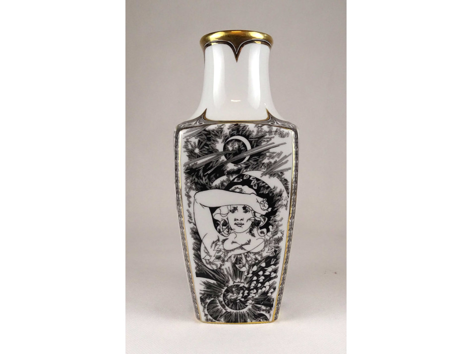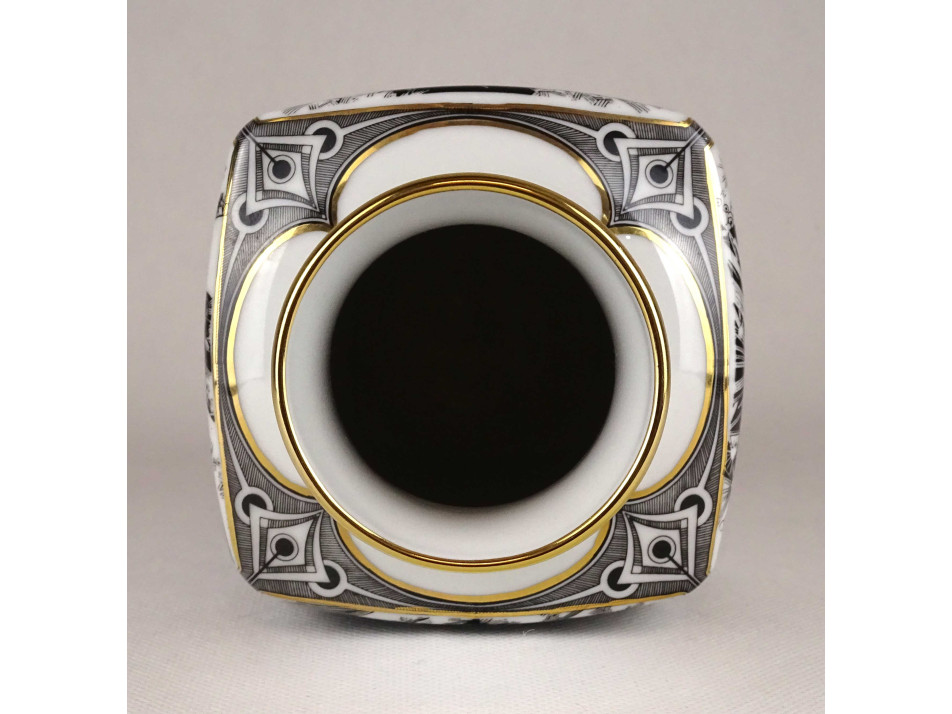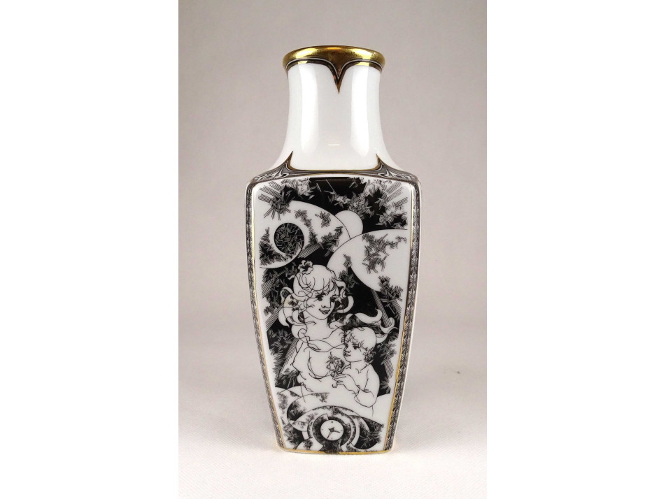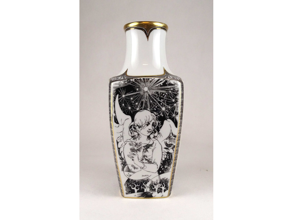 Nagyméretű, hibátlan állapotú, Jurcsák László nőalakokat ábrázoló rajzos, Érosz mintáival díszített, aranyozott, négyszögletű Hollóházi porcelán váza.