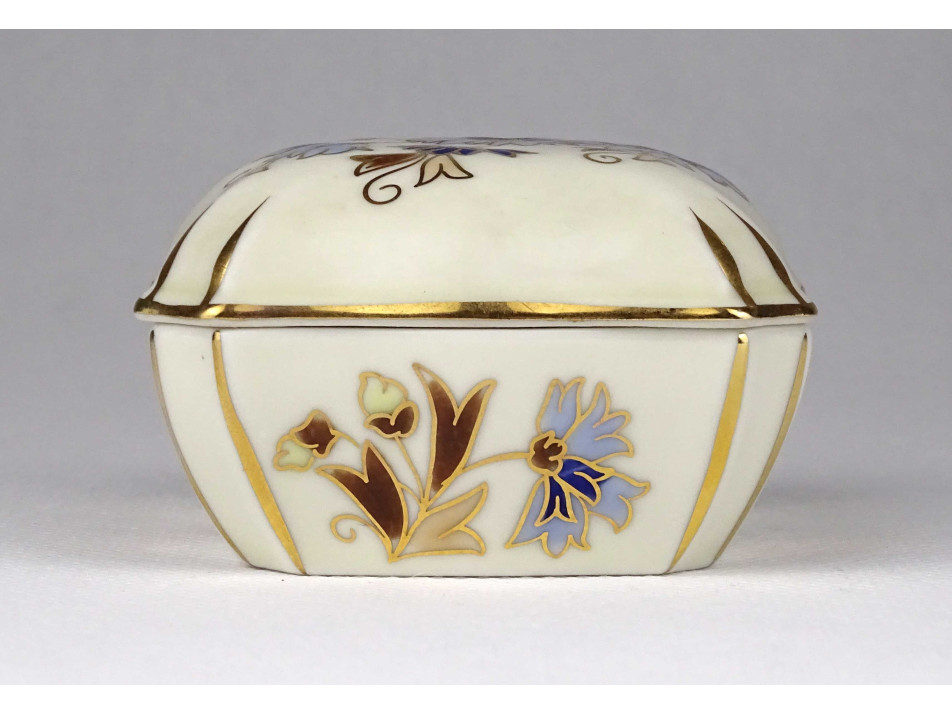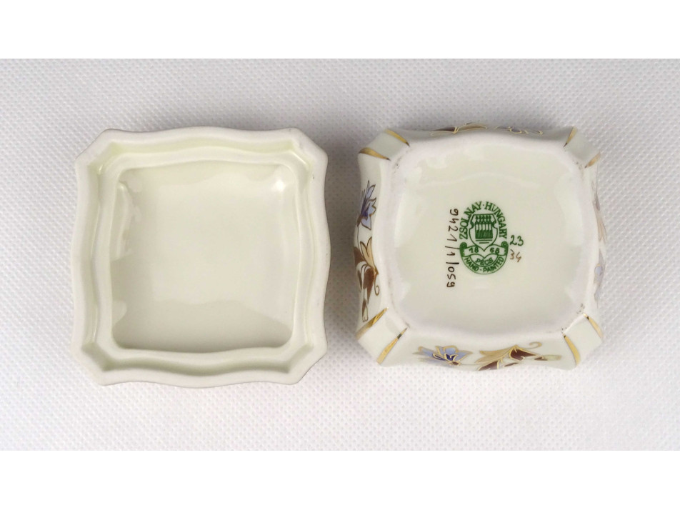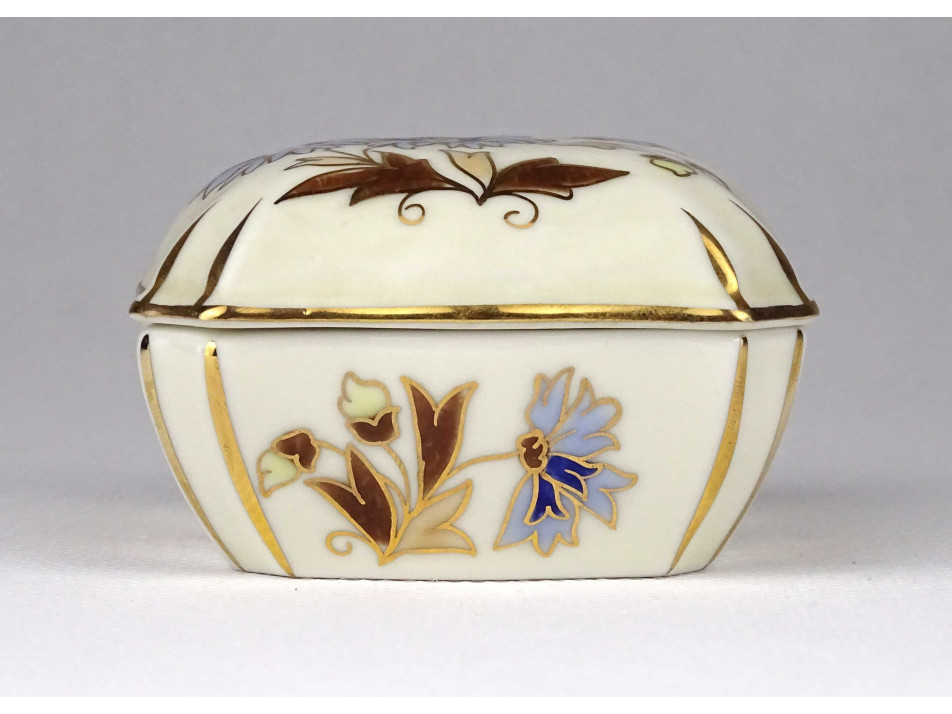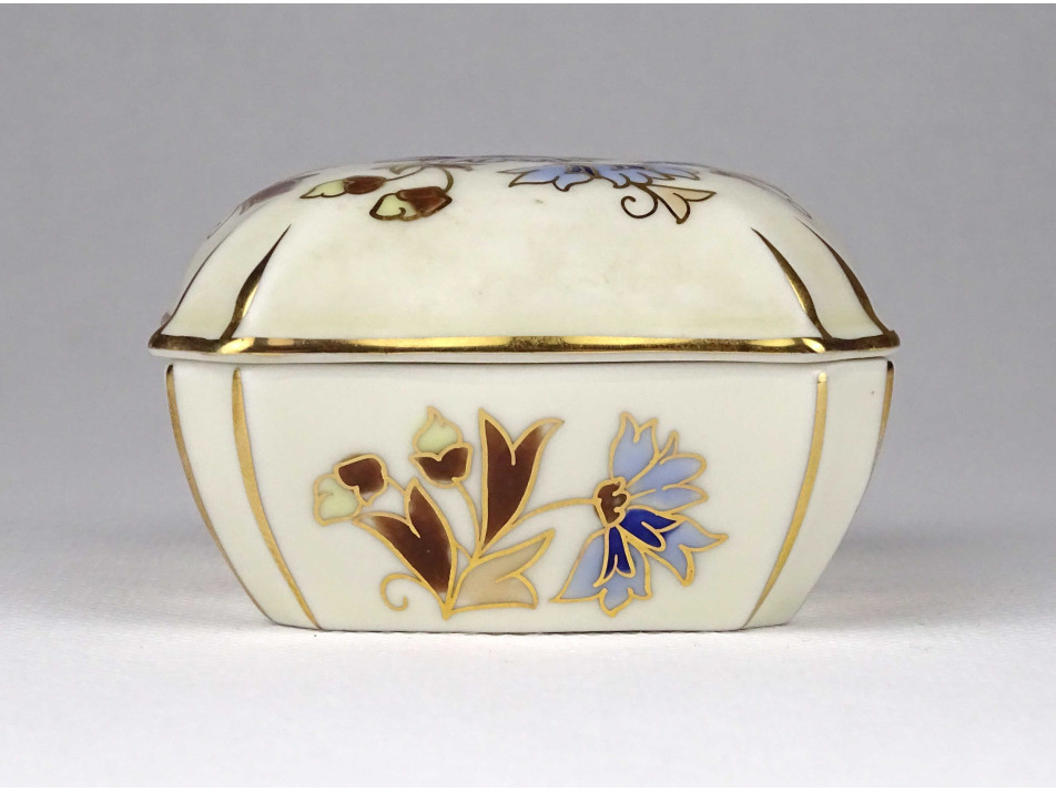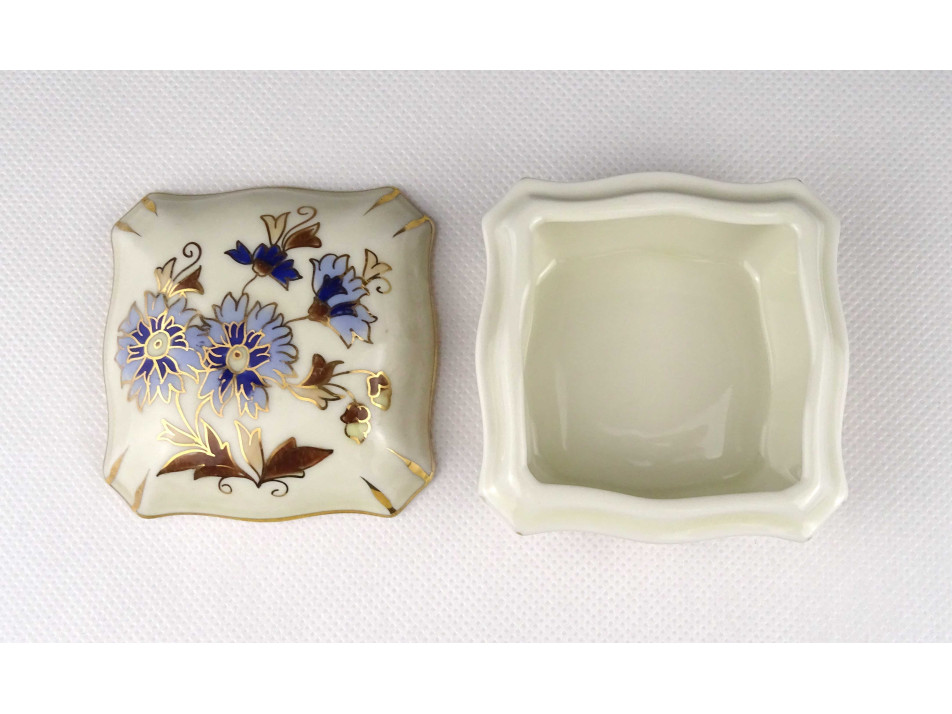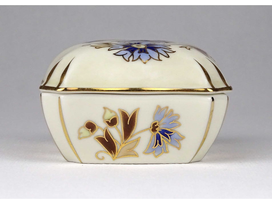 Hibátlan állapotú, vajszínű, aranyozással gazdagon díszített, szögletes alakú, búzavirágos porcelán gyűrűtartó, ékszertartó bonbonier.