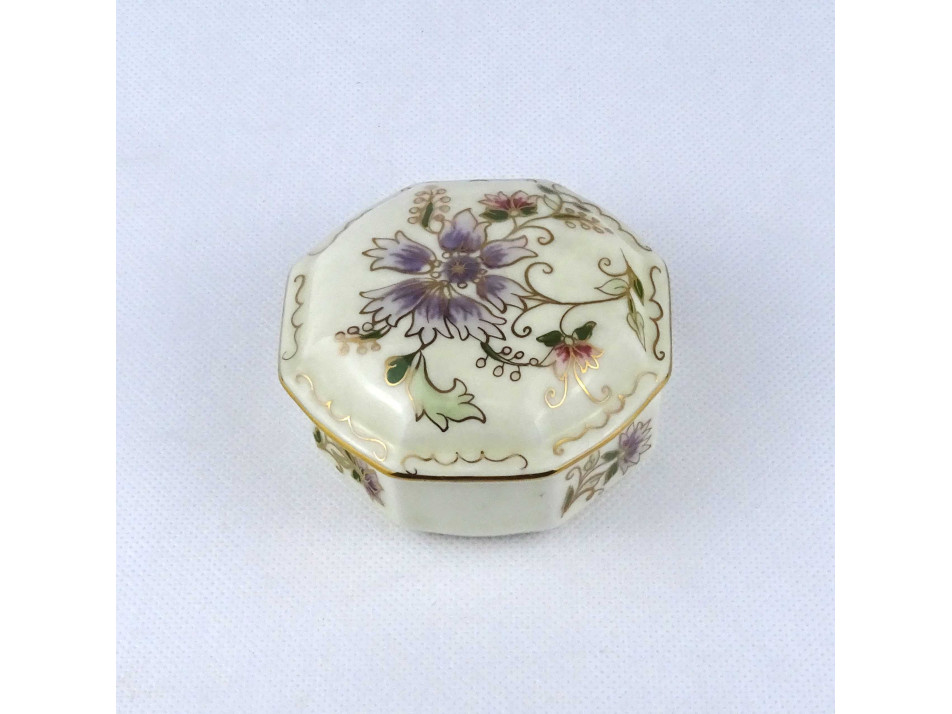 Nyolcszög alakú, hibátlan állapotú, lila virágmintás, vajszínű Zsolnay porcelán bonbonier.