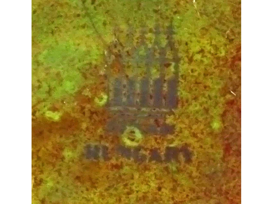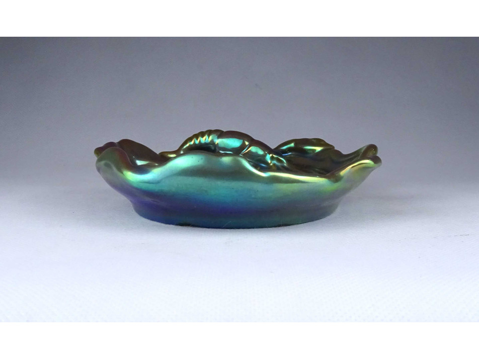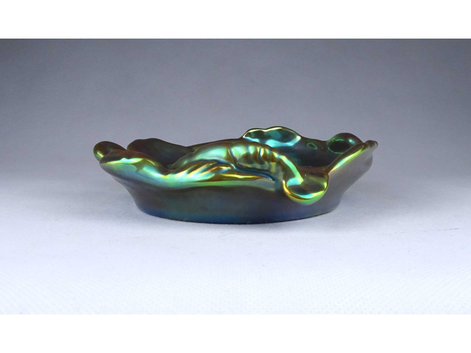 Régi, hibátlan állapotú, zöld eozin mázas Zsolnay porcelán névjegykártyatartó tál, kínáló tál, hamutál. A tál széle fodros, hullámos. A tálat egy nagy méretű rák vagy homár díszíti.