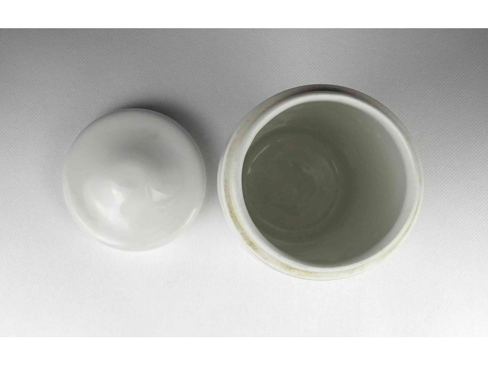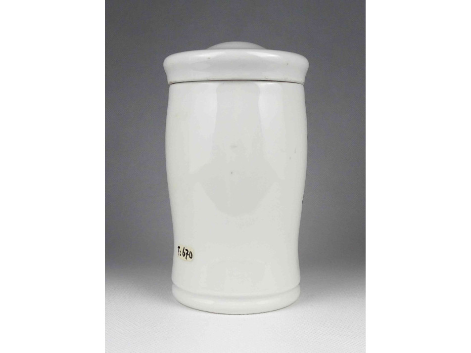 Hibátlan állapotú, nagyméretű gyógyszertári patika edény, tároló. Vastagfalú Zsolnay porcelán tégely, porcelán fedéllel.