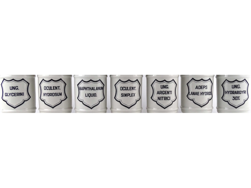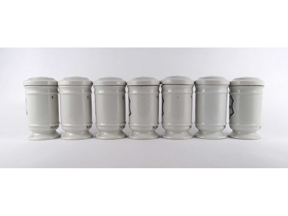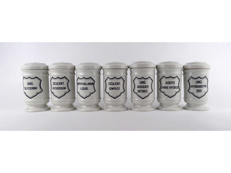 Régi 7 darabos gyogyszertári Zsolnay porcelán patika tégely csomag 13.7 cm
