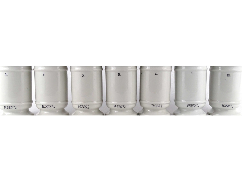 Hibátlan állapotú, gyógyszertári, patika edény, tároló csomag. Vastagfalú Zsolnay porcelán tégelyek, porcelán fedéllel, 7 darab egyben.