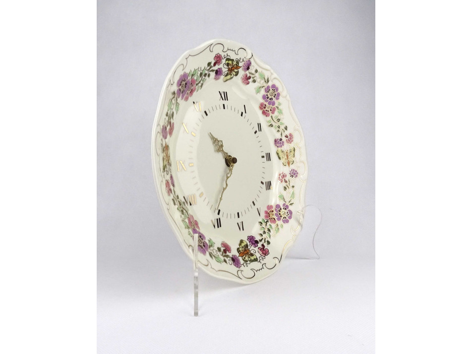 Hibátlan állapotú, dúsan aranyozott, kézi festéssel díszített római szám beosztású, rézmutatós működő, vajszínű pillangós porcelán falitányér, óra.