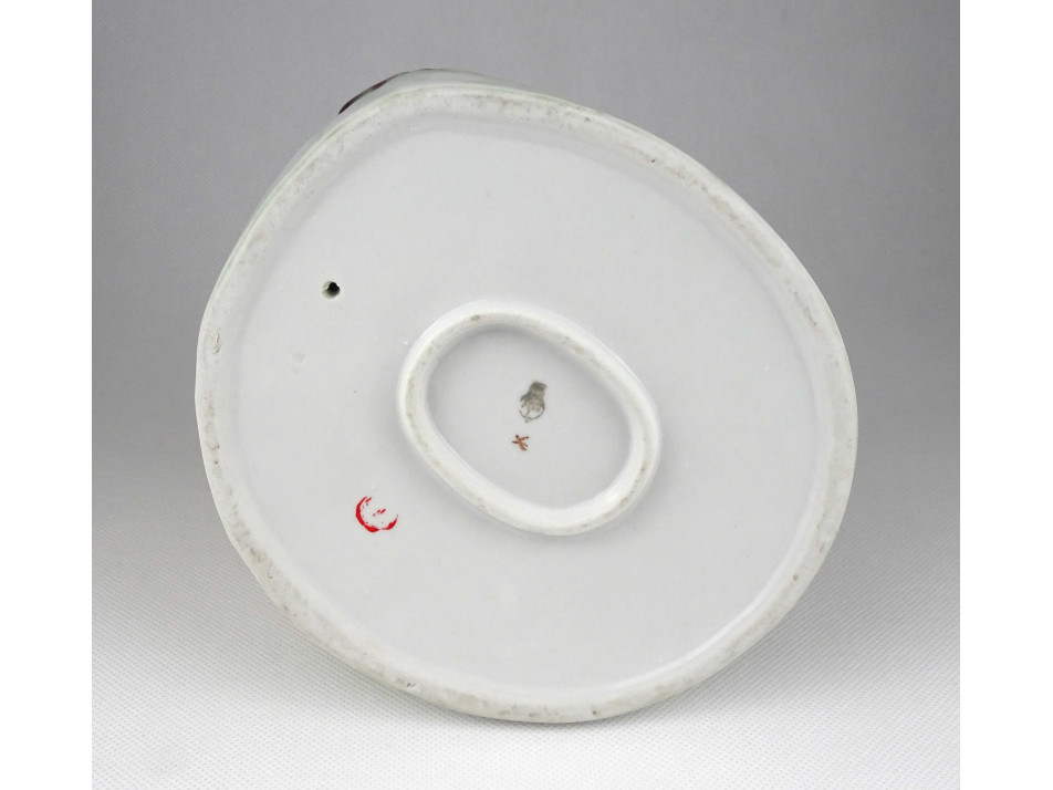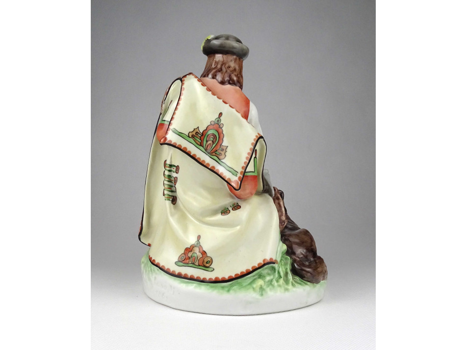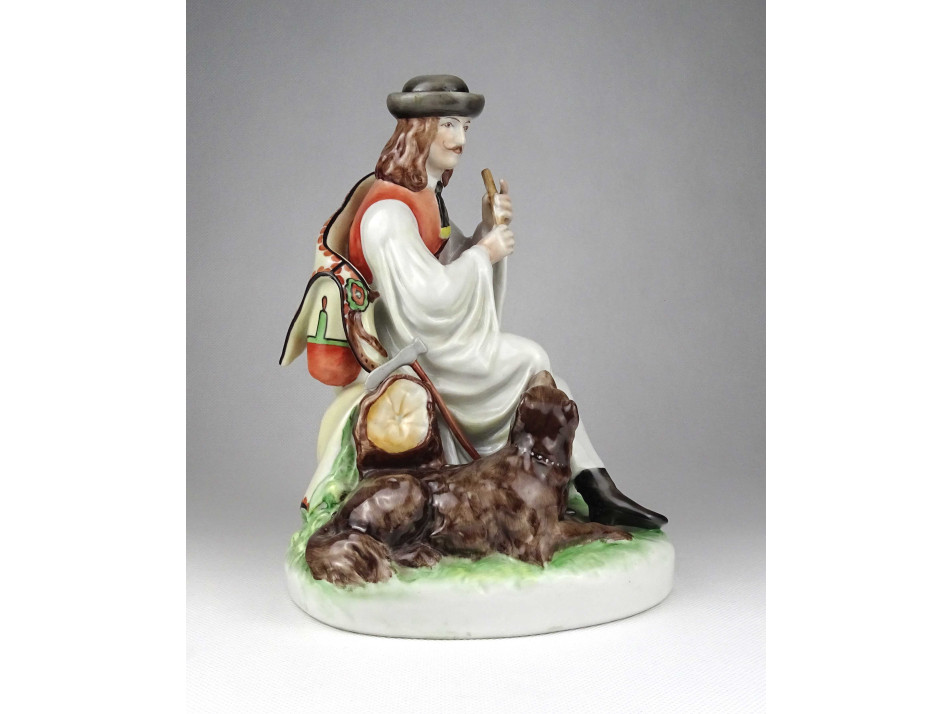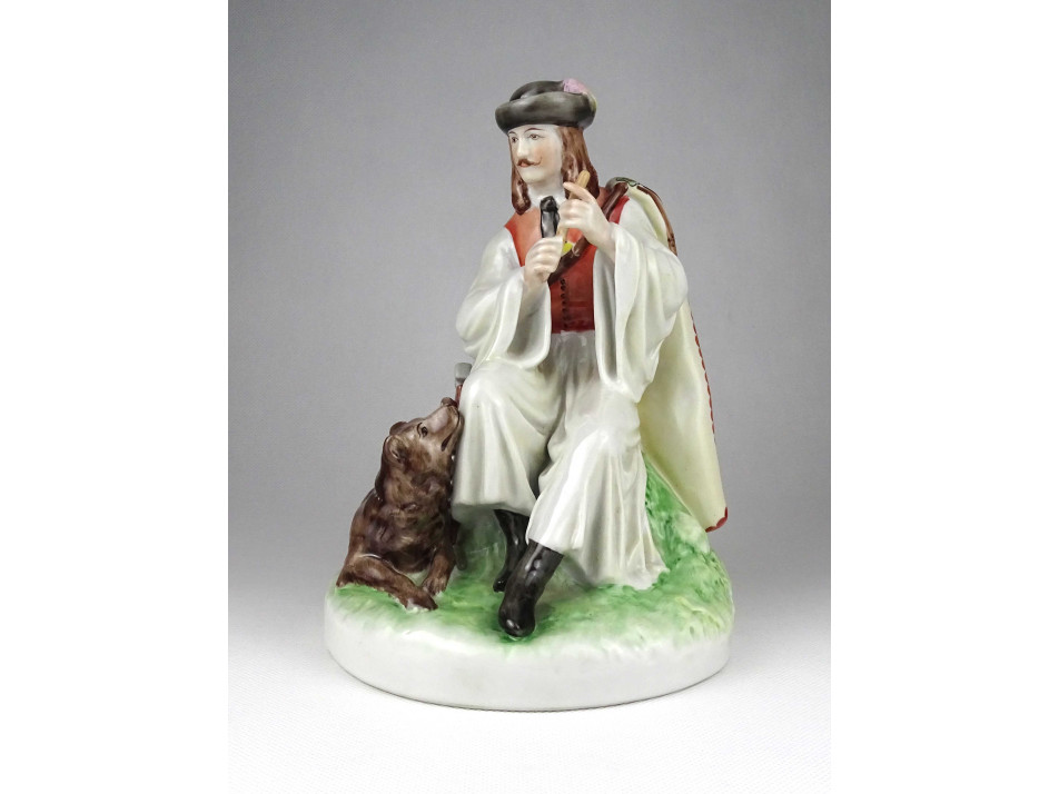 Régi, hibátlan állapotú, Zsolnay - Izsó porcelán figura, kutyájának furulyázó legény tollas kalapban.