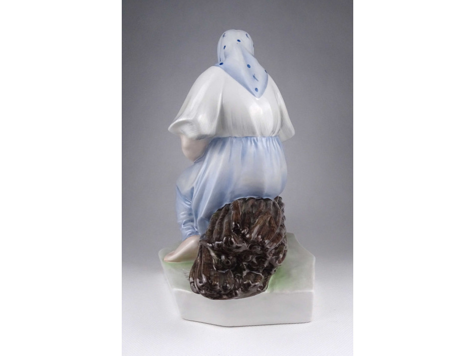 Régi, hibátlan állapotú, nagyméretű, kézi festéssel díszített rőzsekötegen ülő asszonyt ábrázoló Zsolnay porcelán szobor.