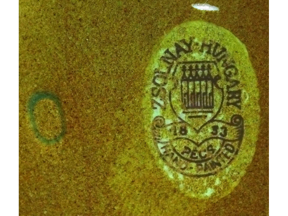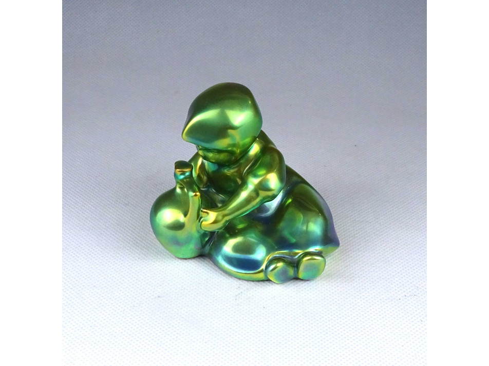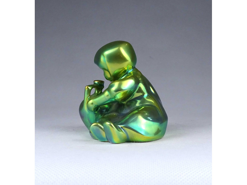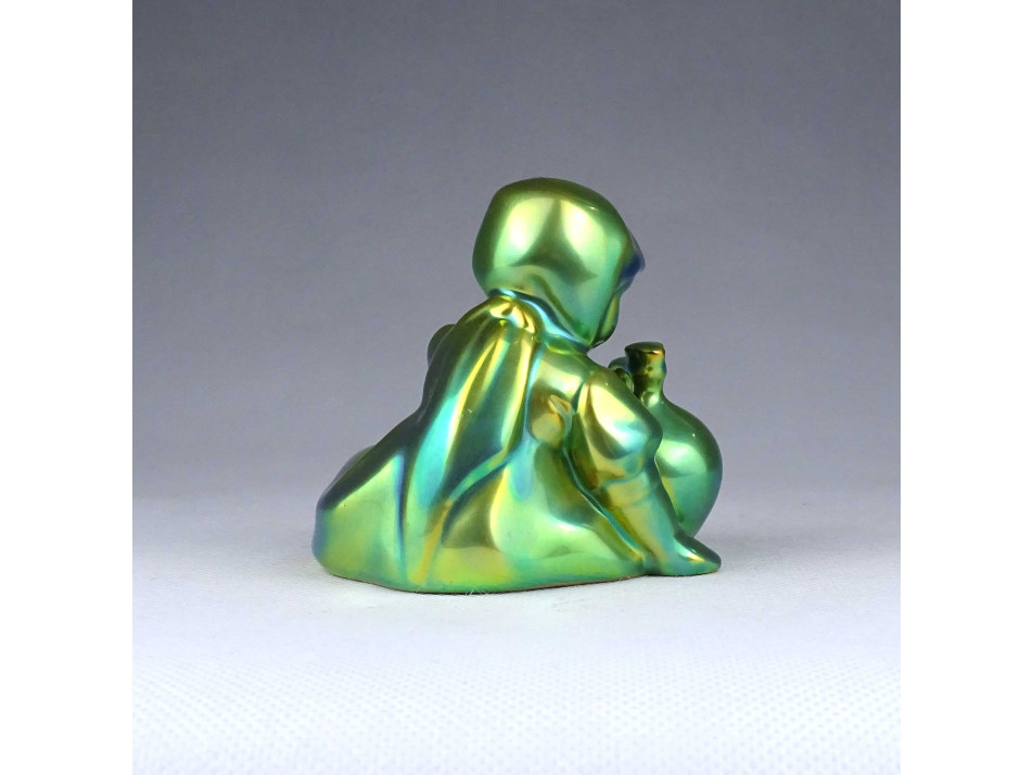 Régi, hibátlan állapotú, zöld eozin mázas Zsolnay porcelán figura, kislány kezében csöcsös korsó.
