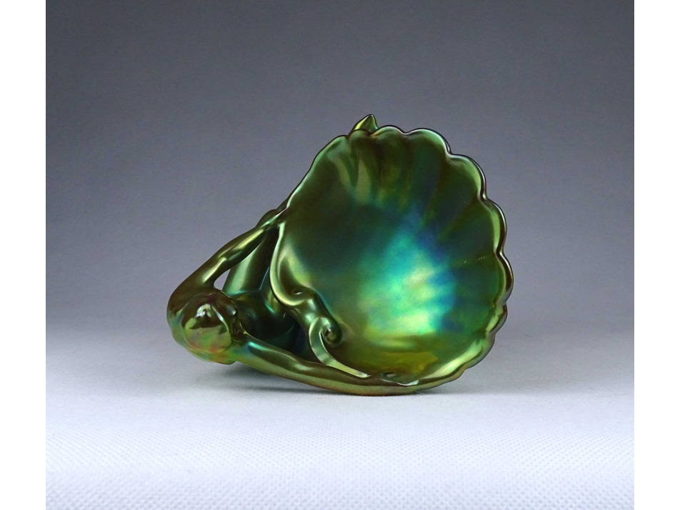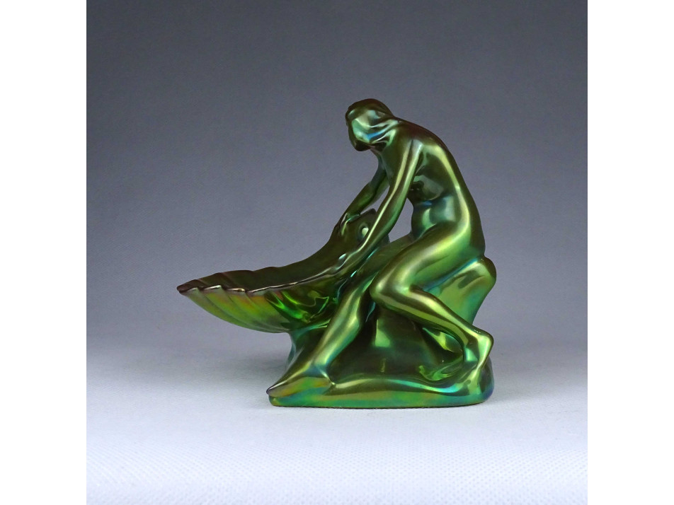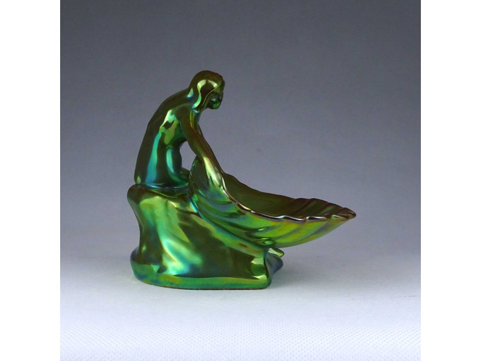 Régi, hibátlan állapotú, zöld eozin mázas, jubileumi jelzéses Zsolnay porcelán, figurális tál, kagylót tartó női akt névjegykártya tartó, íróasztali kellék.