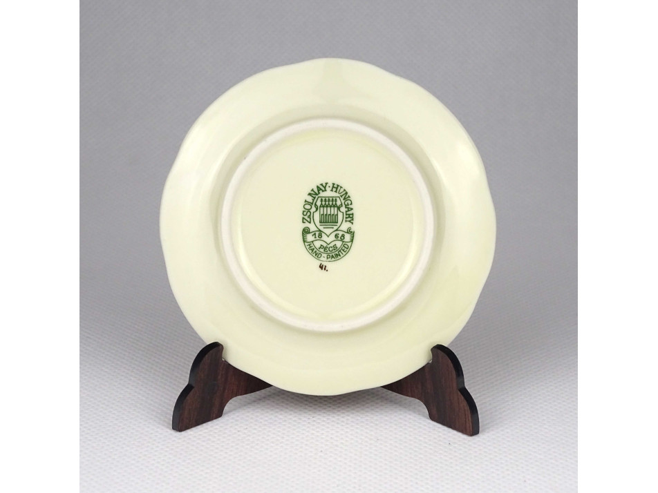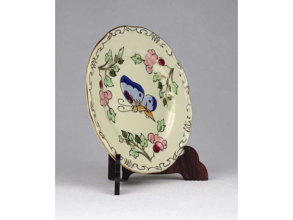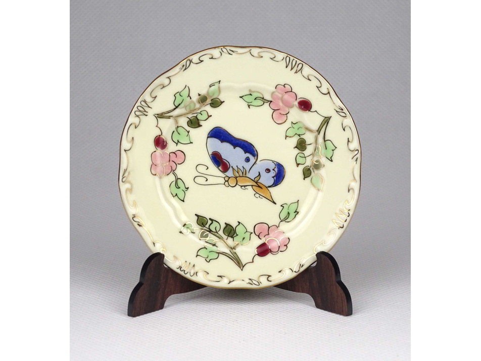 Hibátlan állapotú, gazdagon aranyozott, virágmintákkal és kék pillangóval díszített vajszínű Zsolnay porcelán kistányér.
