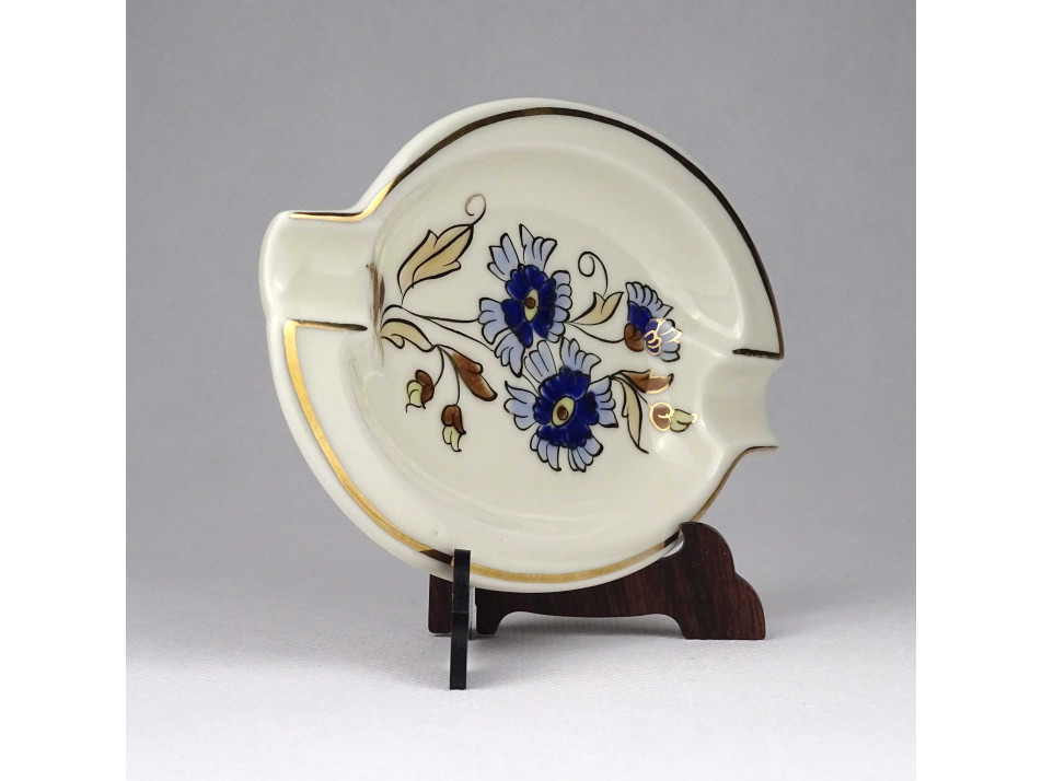 Hibátlan állapotú, vajszínű, búzavirág mintás Zsolnay porcelán hamutál, hamutartó, szélén körben aranyozással.