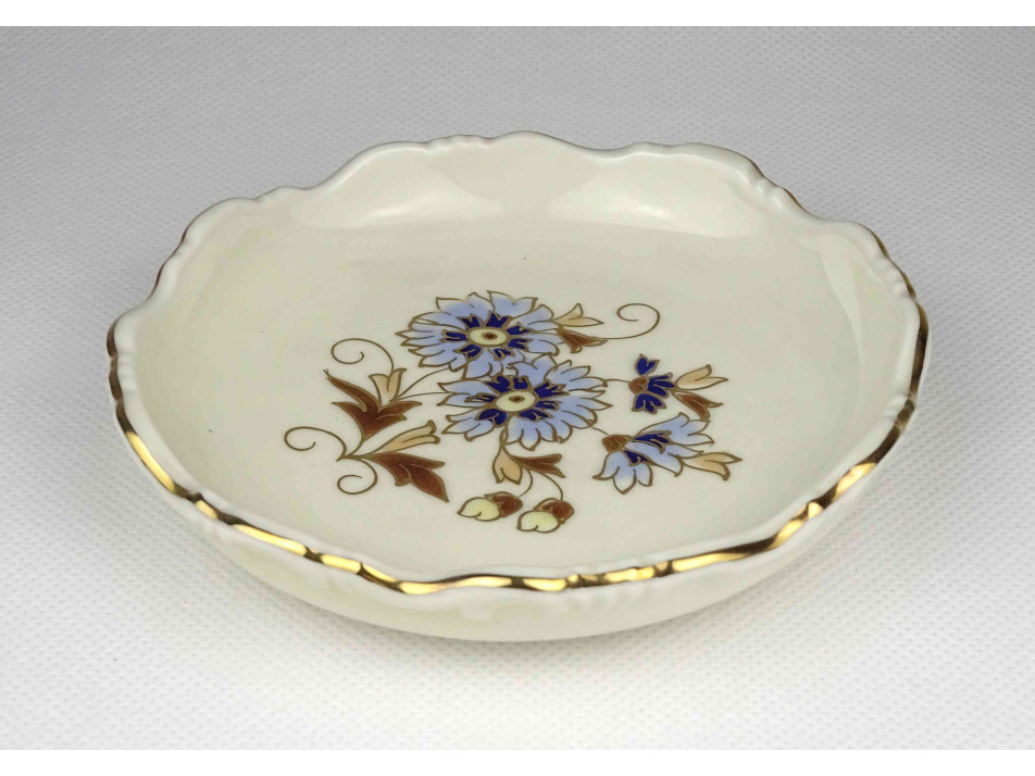 Búzavirág-mintás vajszínű aranyozott Zsolnay porcelán hamutál 12.5 cm