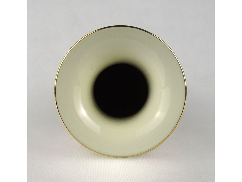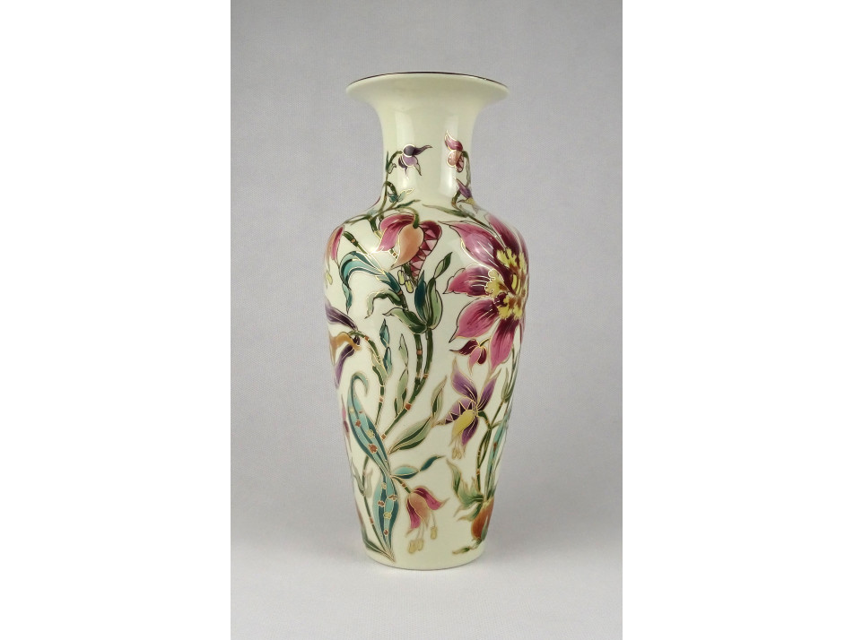 Hibátlan állapotú, újszerű, jelzett, vajszínű, gyönyörű kézi festésű orchidea díszítéses, gazdagon aranyozott Zsolnay vajszínű porcelán váza.