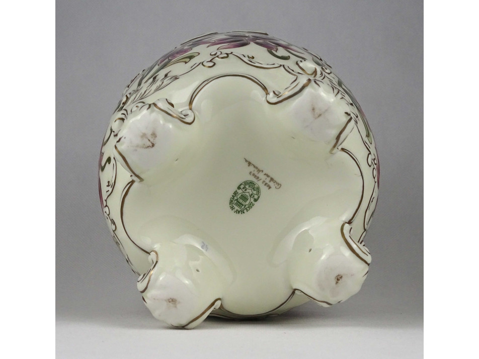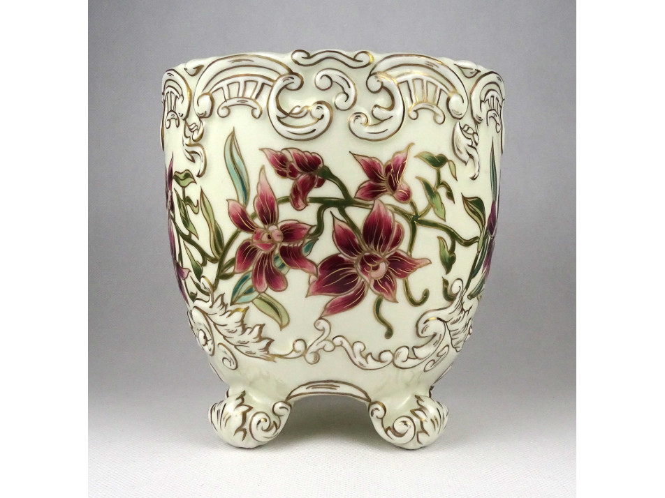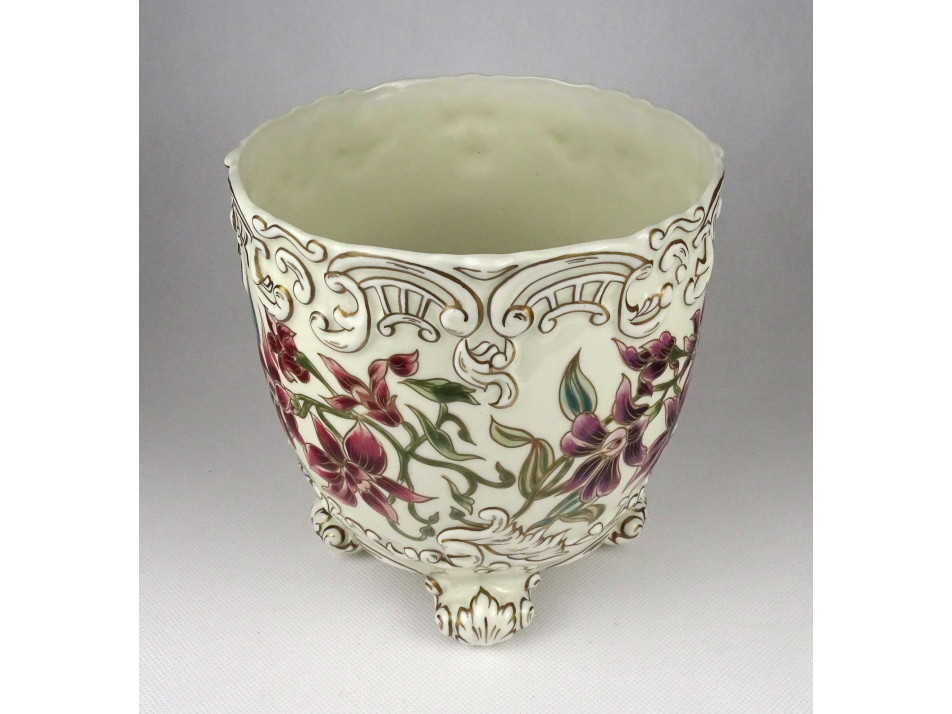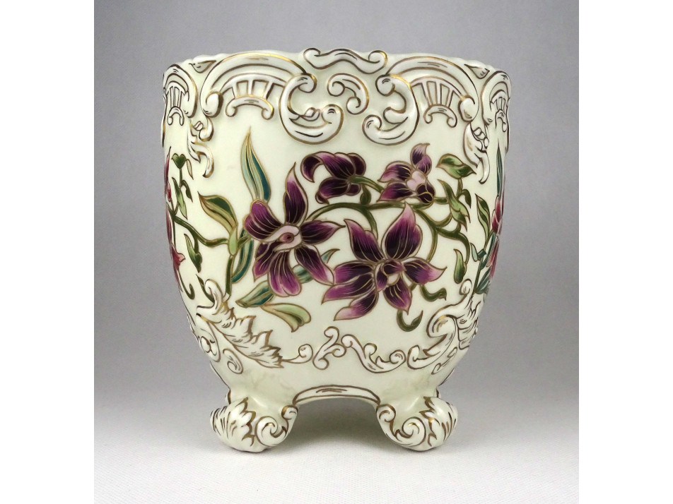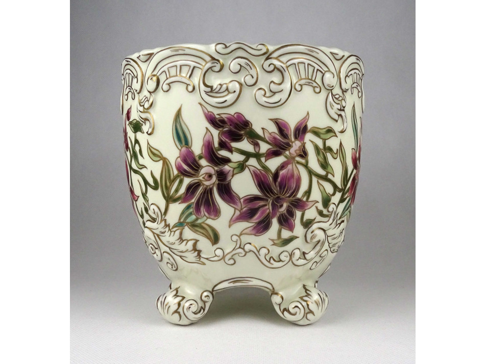 Hibátlan állapotú, nagyméretű, gazdagon aranyozott, orchidea mintával díszített négy lábon álló Zsolnay porcelán kaspó.
