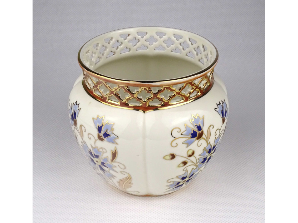 Hibátlan vajszínű áttört búzavirágos Zsolnay porcelán kaspó 10 cm