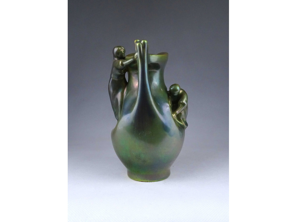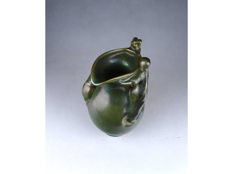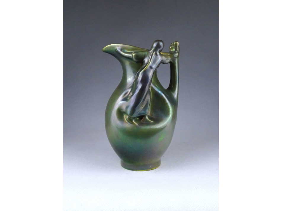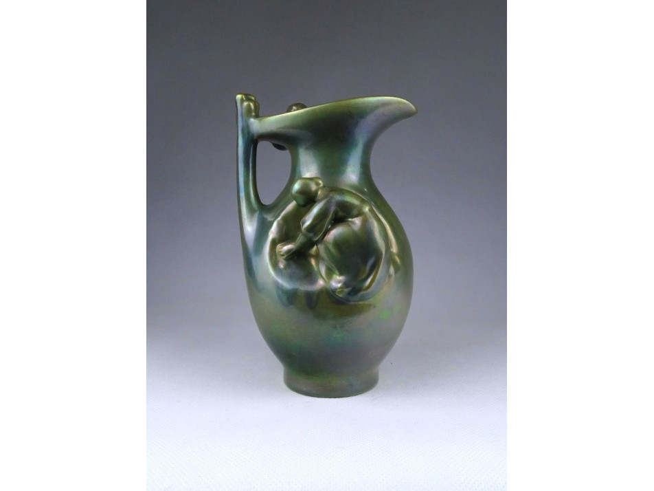 Régi, hibátlan állapotú, zöld eozin mázas Zsolnay porcelán kancsó alakú váza. Oldalán két plasztikus nőalakkal.