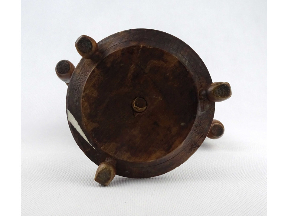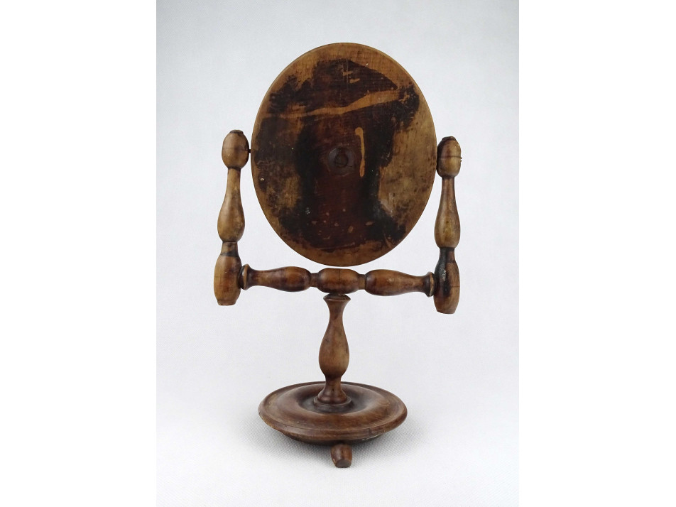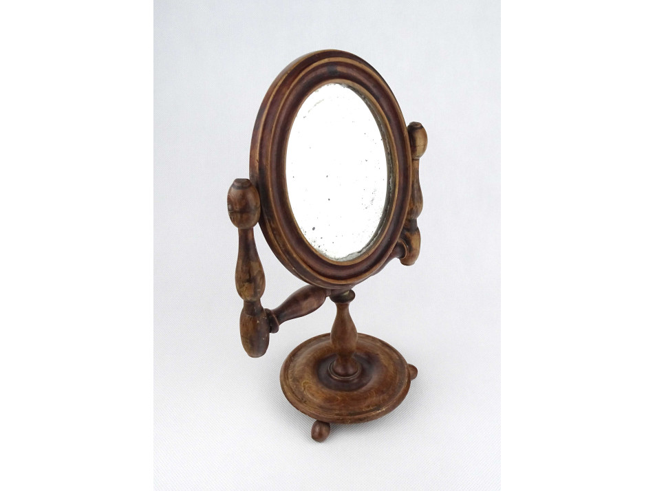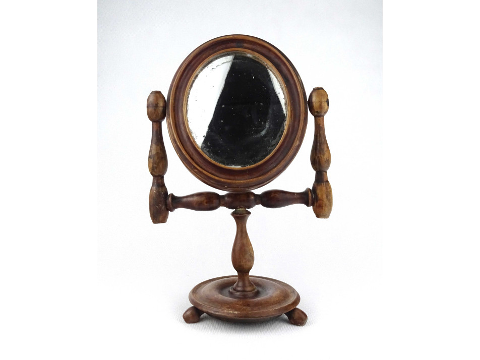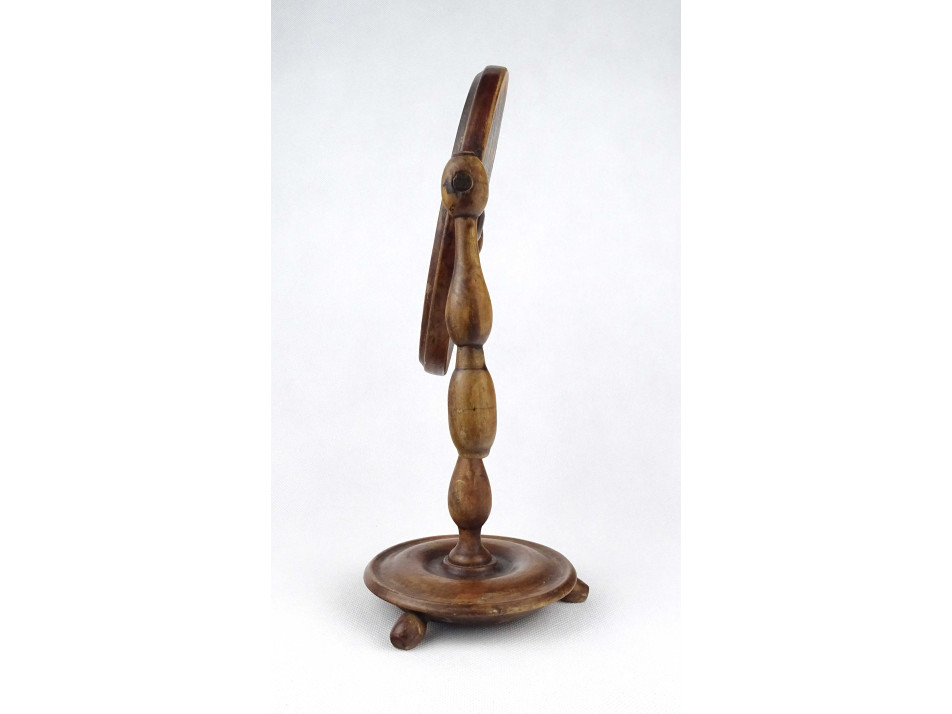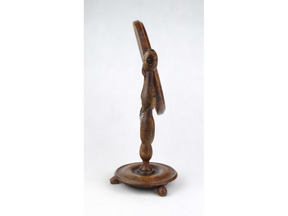 Antik, szép állapotban lévő, esztergált fa, billenő tükrös pipere vagy borotválkozó tükör. A tükre eredeti, néhány apró vakfolt látható rajta.