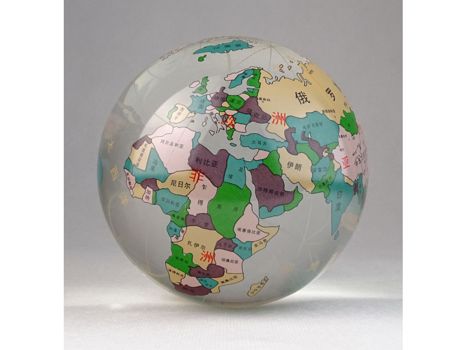 Hibátlan állapotú, kínai üveg földgömb, dísztárgy.