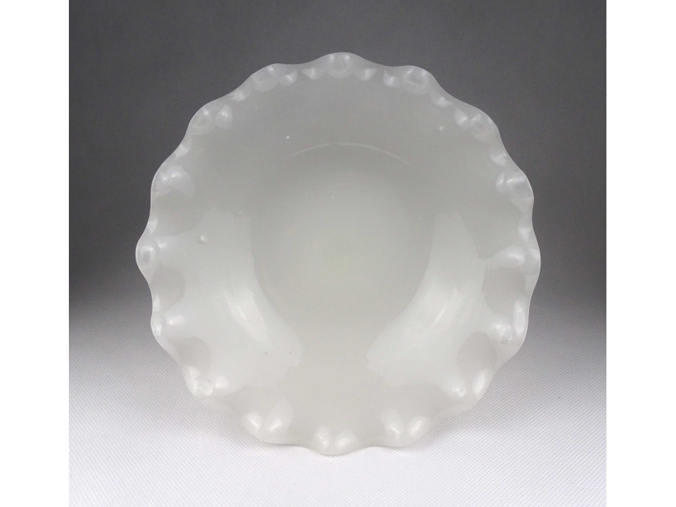 Antik, hibátlan állapotú, fehér kalcedon üveg, fújtüveg művészi talpas asztalközép kínáló tál, gyümölcskínáló tál.