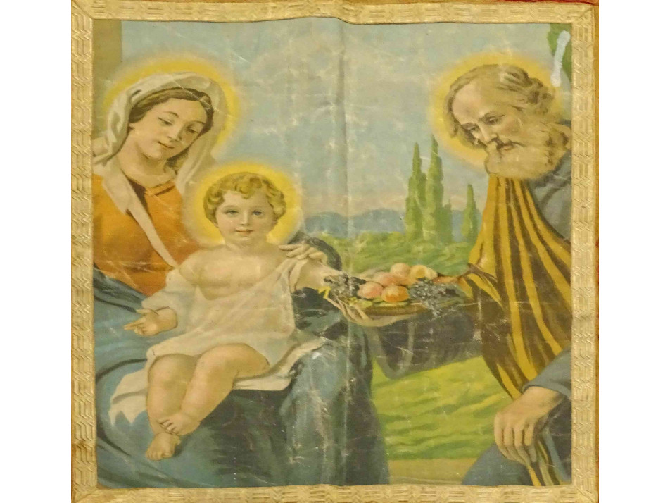 Antik bordó-arany templomi körmeneti zászló kétoldalt festett szentképekkel.