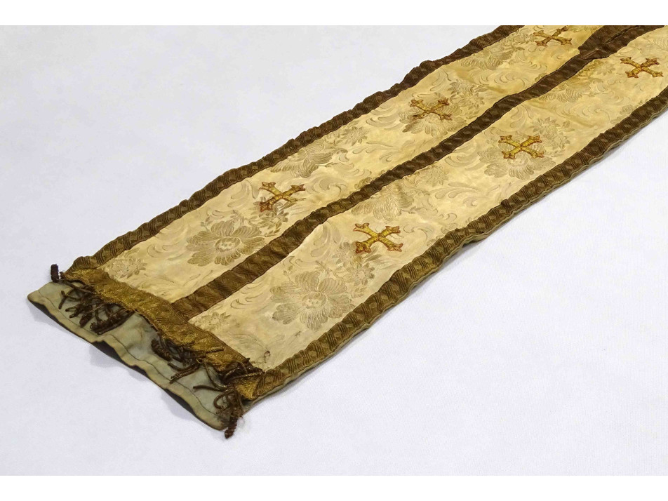 Antik, XIX. századi, szép állapotú, arany színű hímzett brokát Ortodox keresztény, papi stóla. Anyaga vastag arany brokátszövet, körben arany színű selyem brokát szalaggal szegve, két szárán három - három hímzett arany kereszttel díszítve. Alján kissé hiányos fémszálas rojtozás található.